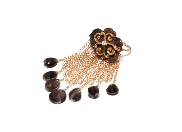 Brown Mother of Pearl Flower Chain and Drops Ring